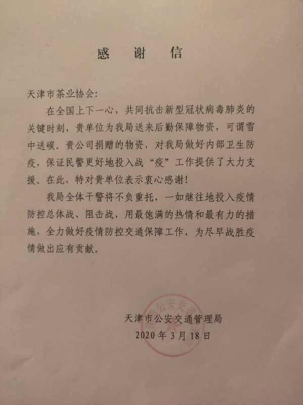 近日,天津市茶业协会会长、福纳百泉茶叶交易中心董事长臧胜群率秘书处全体人员,赶赴抗击新冠疫情一线的医疗机构和消防交管部门,向白衣天使致以亲切的问候,感谢大家在疫情肆虐时不分昼夜冒着生命危险抢救患者所付出的辛苦和努力;向守护人民生命财产安全的消防指战员和交管官兵表示感谢和慰问。并向所有的“逆行者”赠送慰问品,表达钦佩之情和崇高的敬意!