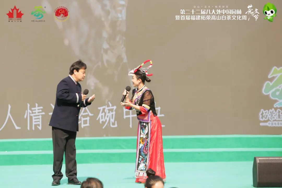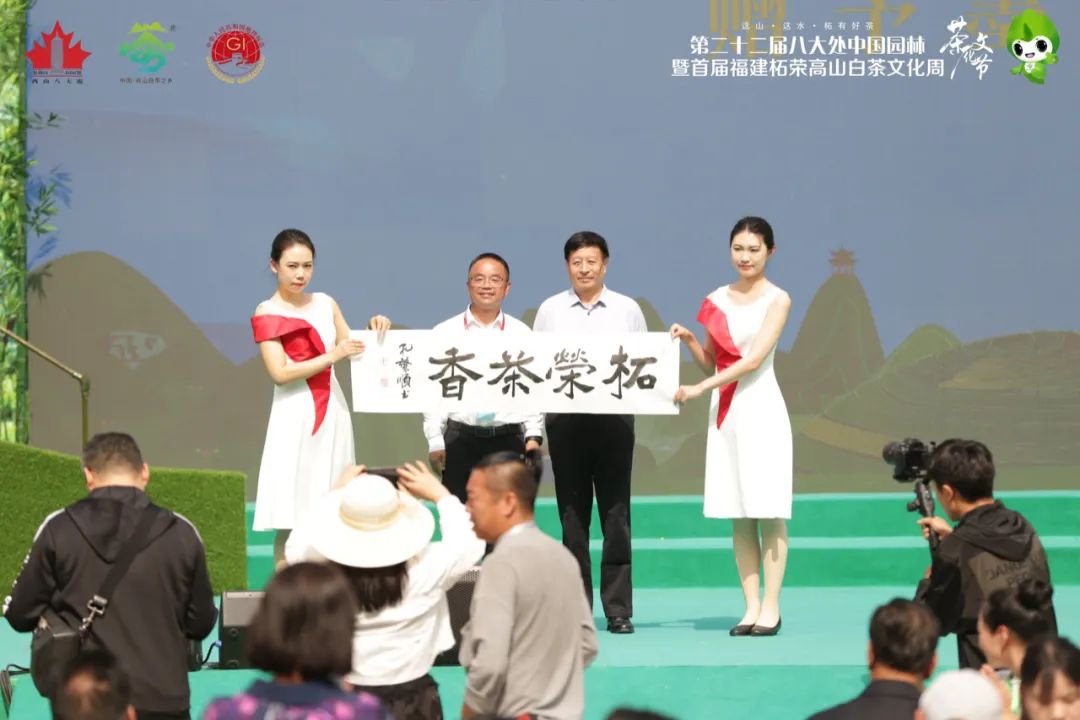 北京市八大处公园管理处党组成员、副主任王霞致辞,柘荣县人大常委会主任、柘荣县茶产业发展领导小组组长陈龙营作柘荣高山白茶推介,人民解放军某部原政委、少将孔繁顺赠送“茶乡柘荣”、“柘荣茶香”两幅墨宝。